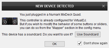 A detection window will appear when the unit is first connected with VirtualDJ.