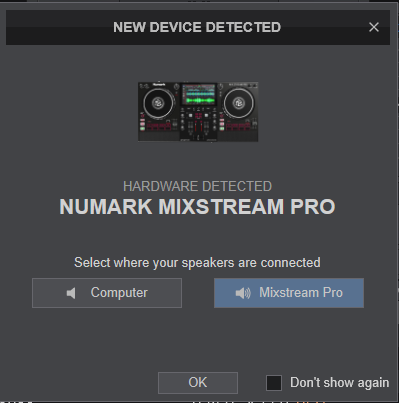 Select the Mixstream Pro button in order VirtualDJ to apply the pre-defined audio configuration (speakers need to be connected to the rear side of the unit in this case), or Computer if you don't have any speakers to connect to the Mixstream Pro and need to output sound from the default sound card of your computer.