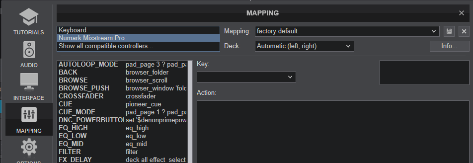 The device should be visible in the MAPPING tab of VirtualDJ Settings and the “factory default” available/selected from the Mappings drop-down list.
