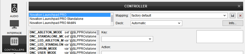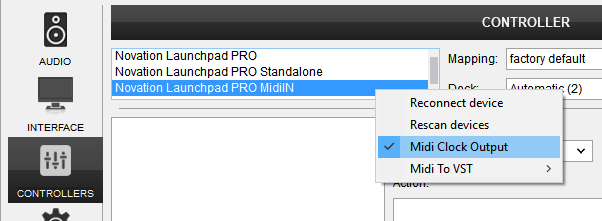The Launchpad Pro is detected as 3 different Midi devices as shown in the Controllers tab of VirtualDJ Settings and those represent a pair of Midi In/Out ports. The Novation Launchpad Pro (default device) and the Novation Launchpad Pro Standalone offer similar functionality as described in this manual, with Sampler, Effects, Mixer and Deck Control modes. The MidiIN device has no MIDI functionality and is mostly used to send and receive Midi Clock signals, to synchronize external devices and applications.