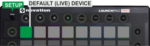 To select the default (also known as "Live") device press the SETUP button and then press Pad Nr.1 (green)