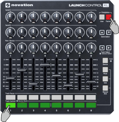 When VirtualDJ starts with the Launch Control XL connected, the device starts on Factory Template 1 (default Template). You can select this Template anytime, by holding down the