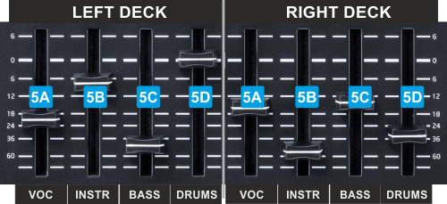 5AAdjust the level of the Vocals Stem channel of Left/Right Deck5BAdjust the level of the Instruments Stem channel of Left/Right Deck5CAdjust the level of the Bass Stem channel of Left/Right Deck5DAdjust the level of the Drums/Rhythm Stem channel of Left/Right DeckBOTTOM BUTTONS - FX SEL & ON