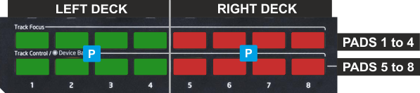 PTrigger Pads 1 to 8 of the selected Pads Page for the Left/Right Deck. See PadsTrigger the Shift-assigned action of of Pad 1 to 8 of the selected Pads Page. See PadsOTHER BUTTONS
