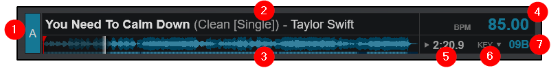 - TITLE AND ARTIST. Displays the title, artist and remix (displayed in brackets if available) of the track according to the tagged information. This information can be modified in the Tag Editor.