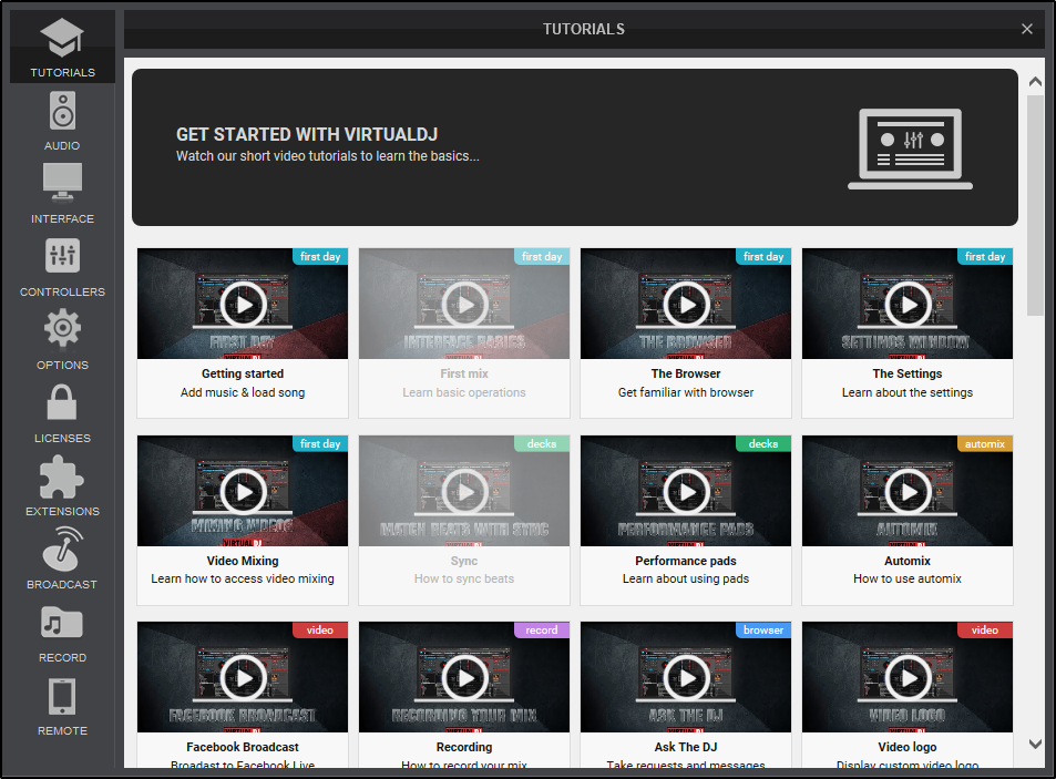 The Tutorials tab provides the ability to watch video tutorials without leaving the software (internet connection required). Each tutorial is labeled with a category to quickly find what you are looking for. After watching each video, the thumbnail will fade out to show that it has been watched. You can always return to previously viewed videos at any time.