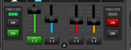Once the Timecode Inputs are set as above in the Audio setup, the TIMECODE panels will appear at the SCRATCH center panel of the default 4 deck skin. Use the ON buttons to enable the timecode control to any of the 4 software decks.