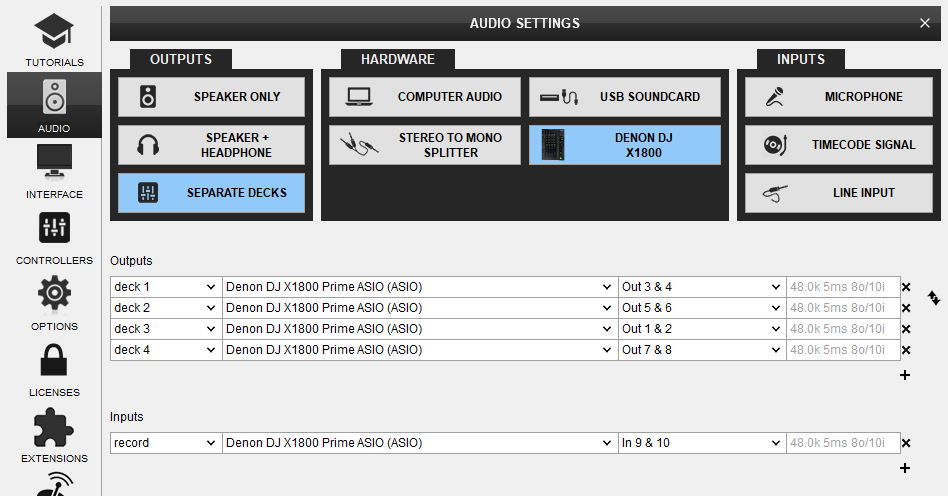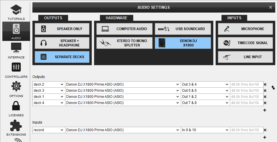 For the above to work as expected, the USB Audio Interface Channels need to have the default assignment. By default the firmware of the Denon DJ X1800 has assigned Channels as followed: