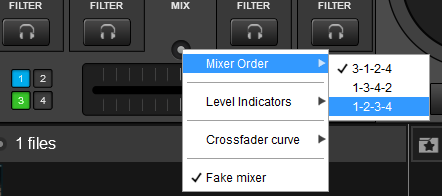 A different mixer order (1-2-3-4 or 1-3-4-2) can be applied from the Mixer Options in the 4 decks skin or from VirtualDJ Settings (mixerOrder setting).