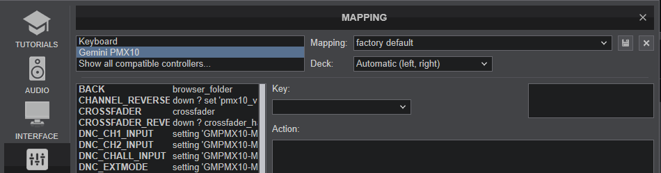 The unit should be visible in the CONTROLLERS tab of Config and the “factory default” available/selected from the Mappings drop-down list. The factory default Mapping offers the functions described in this Manual, however those can be adjusted to your needs via VDJ Script actions.