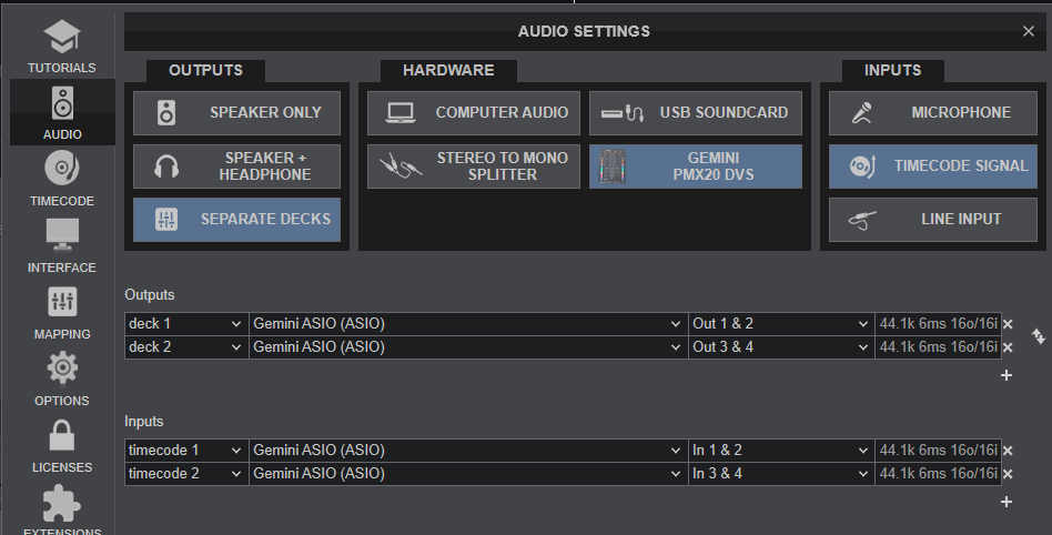 In this mode the USB Audio Interface of the Gemini PMX20 turns into 4out/4in channels, offering control of 2 VirtualDJ Decks (the middle ones) along with DVS/Timecode controls. The outer PMX20 mixer channels 3 and 4 can be used to route signal from externlal sources, but cannot control any VirtualDJ Deck.