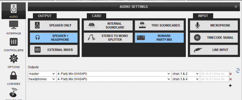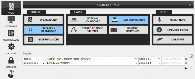 Select the built-in sound card of your computer for the Master (on Chans 1,2) and the Party Mix sound card for the Headphones (at Chans 3,4)