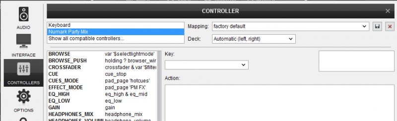 The unit should be visible in the CONTROLLERS tab of Config and the “factory default” available/selected from the Mappings drop-down list. The factory default Mapping offers the functions described in this Manual, however those can be adjusted to your needs via VDJ Script actions.