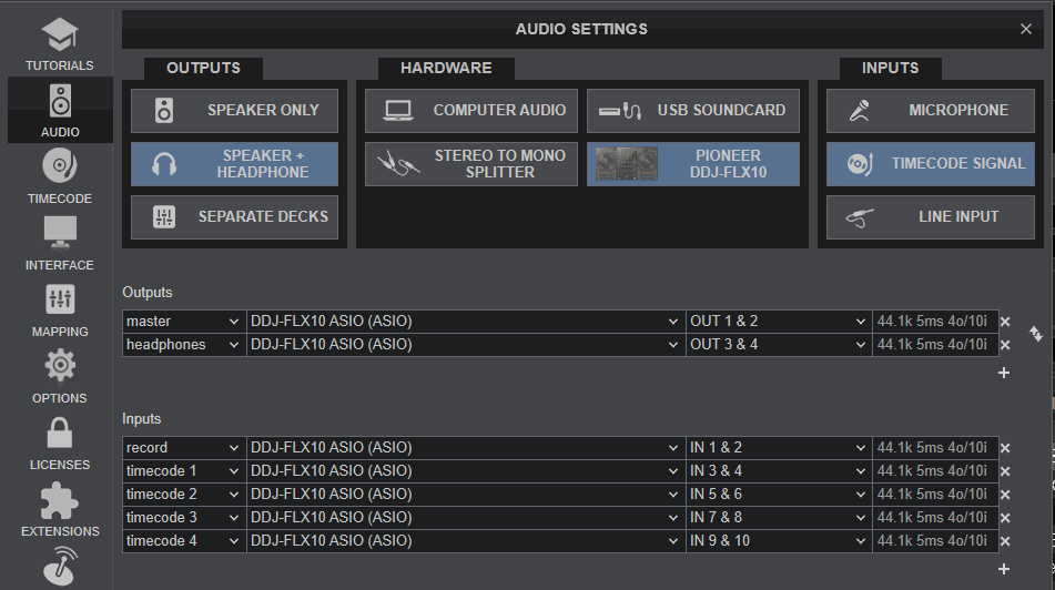 If you want to use Timecode Vinyls to control decks 1 & 2 instead then you should create the following audio setup:
