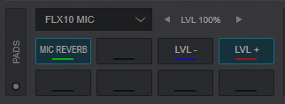 To access control to this Fx, hold down the HOTCUE mode button (on any of the Decks) to get the FLX10 MIC page on Pads (or select it from the GUI) and then use the Pads to turn the Reverb FX on Mic on/off and adjust the Reverb Parameter/Level.