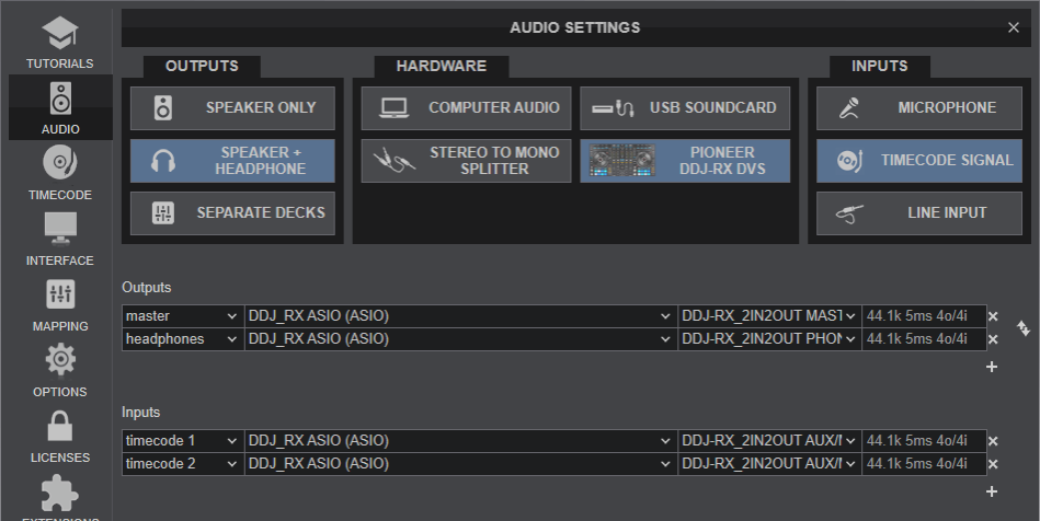Once the DVS On Pad is selected, go to VirtualDJ Settings->AUDIO tab and click on the Pioneer DDJ-RX DVS special button at the top of the window to auto-create the sound setup for this mode as per the following image.