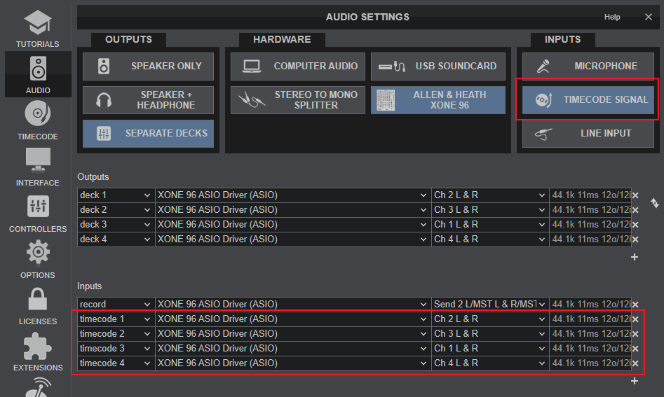 Xone 96 - Rear panel - Timecode Inputs - Open VirtualDJ Settings and select the AUDIO tab.