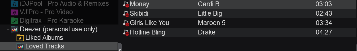 You can now use the root Deezer folder to search their catalog directly from the VirtualDJ search bar. Expanding the Deezer folder using the button will also display your saved Deezer playlists.