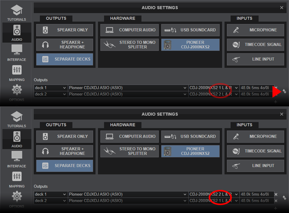 If the audio output of your CDJ's is inverted (left side CDJ plays the sound of right software side)