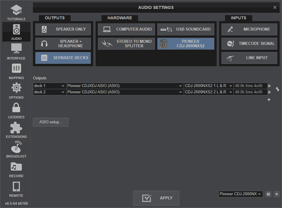 Click on the "CDJ-2000NXS2" (or your own CDJ's model) button for VirtualDJ to apply the predefined audio setup with the sound cards of CDJ-2000NXS2. You can still change that from Settings->AUDIO tab.