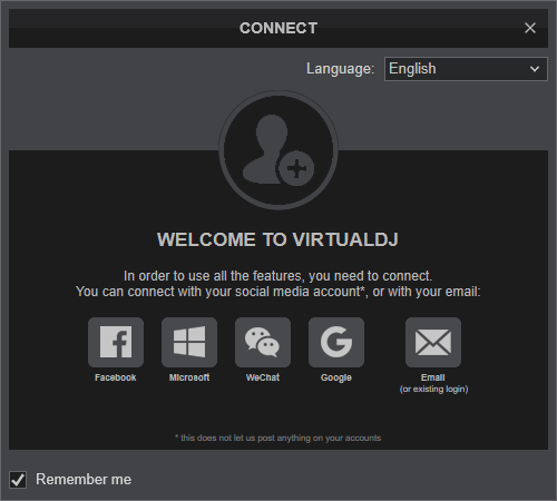 Once VirtualDJ is launched, a Login Window will appear. Please login with your preferred method from the ones provided.
