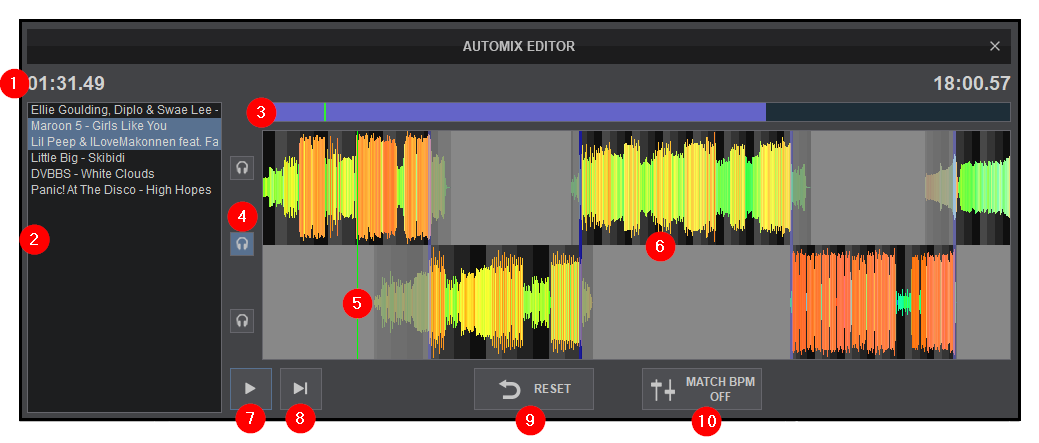 - PROGRESS DISPLAY. The left value indicates the current position of the Playhead, while the right value indicates the total time of the Automix and will be updated along with all edits performed.