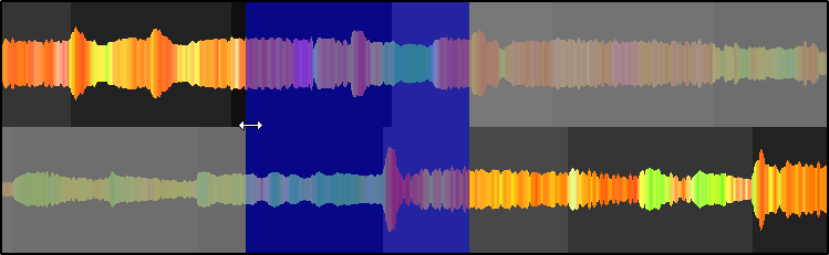 - TIMELINE. Provides a visual display of the audio information from the playlist. It displays the waveforms of each track, the beatgrid using the grayscaled background, and each automix point (marked in blue). The Timeline can be zoomed in or out to make precise Automix adjustments with a wheel mouse.