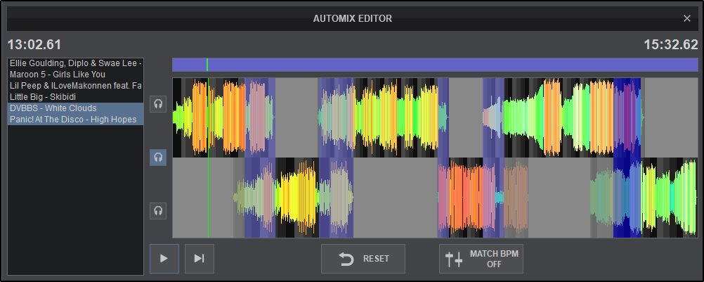 - Continue to adjust each automix point as required, using the mouse to zoom in and out to make fine adjustments while pre listening to the mix points. Highlight any mix point to toggle on/off Match BPM or Reset it to the original automix point.