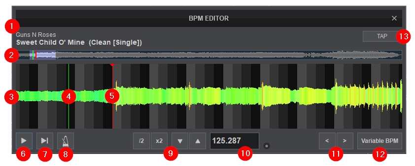 12. VARIABLE BPM. For tracks that have a tempo change, this button is used to add and remove additional beat anchors. Once clicked, the display will change to provide these options.