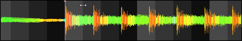 4. If the BPM value and the CBG are incorrect and the BPM value is unknown, drag and move the Beatgrid Anchor to the beginning of the first beat. Place your mouse on the gray scaled background of the waveform between the 1st and 2nd beat until the mouse pointer changes to a double-sided arrow Click and move this point to the beginning of the 2nd beat. The BPM will be re-calculated, based on these adjustments.