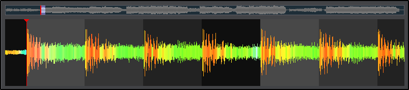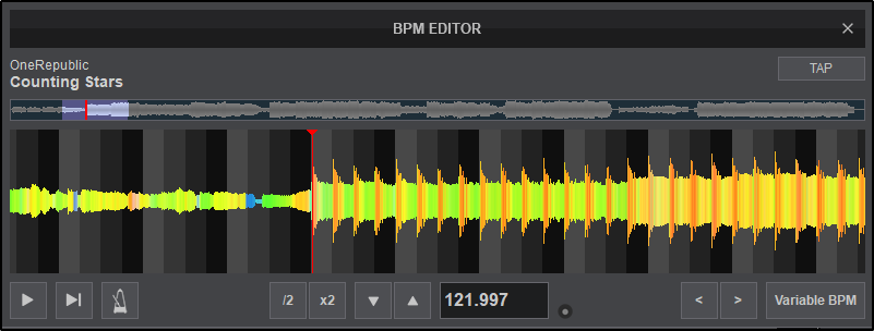 2. Once the BPM Editor is opened, the track will be analyzed and the multi-colored waveform will be displayed, providing information of its structure, based on the detected frequencies. The grey-scaled background indicates the 4 beat pattern of the Beat Grid of the track. The red vertical line indicates the Beatgrid anchor (first detected beat).