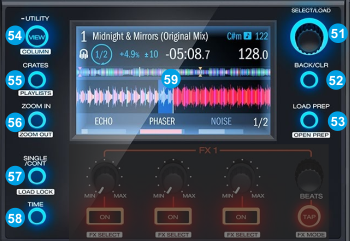 Hold SHIFT down and use this button to turn on/off the blinking of the SELECT/LOAD Led when track reaches its end. - LCD. 5" RGB screen. Displays various Track's info, Browser view, waveforms etc. See details below