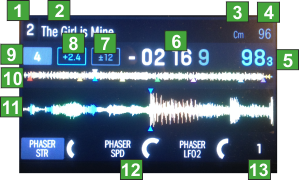 10Track Progress bar: This is the currently loaded track's waveform, which is color-coded according to the frequency of each area: red indicates low (bass) frequencies, green indicated mid-range frequencies, and blue indicates high (treble) frequencies.