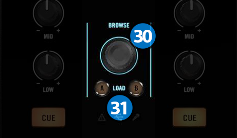 Push: Sets focus to the Folders list or opens/closes subfolders if focus is on the folders list. When SHIFT is pressed if focus is on the Folders list, enters the Songs List. If focus is on Songs list it loads the selected track. - LOAD: Press one of these buttons while a track is selected to load it on the corresponding deck. Press and hold the same button for more than 1 second, to unload the same deck.