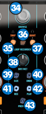 BROWSE: Knob: Scrolls through files or folders. When SHIFT is pressed it changes the focused area between folders, songs and the sideview. Push: Sets focus to the Folders list or opens/closes subfolders if focus is on the folders list. When SHIFT is pressed if focus is on the Folders list, enters the Songs List. If focus is on Songs list it loads the selected track.