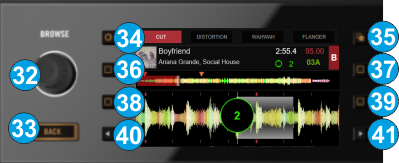 - SCREEN BUT 2 : Returns to Decks view when Display is in Browser view. When in Decks view, use this button to toggle between 2 and 4 Decks view.