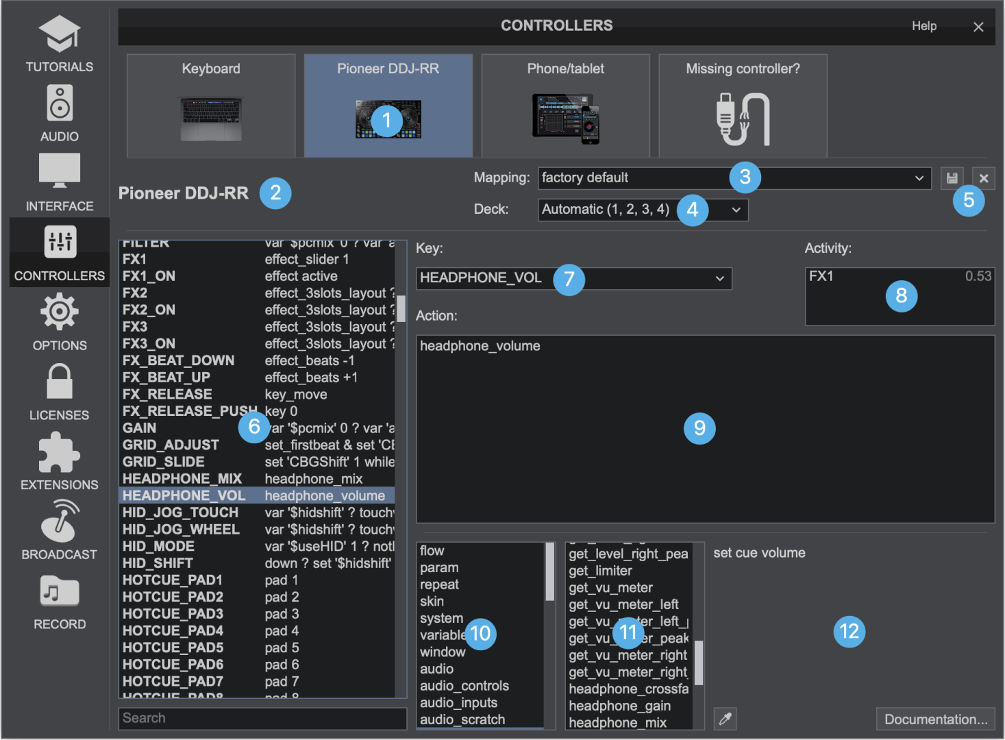 - DESCRIPTION - Provides a description of the current script. Additionally, there is a mapping tool (eye dropper) to the lower left of the box to easily pick out skin elements that a button could be mapped to, and automatically mapping the button with a few mouse clicks. To the lower right is a Documentation... button that will open a web browser and provide more details about VirtualDJ script actions and syntax.