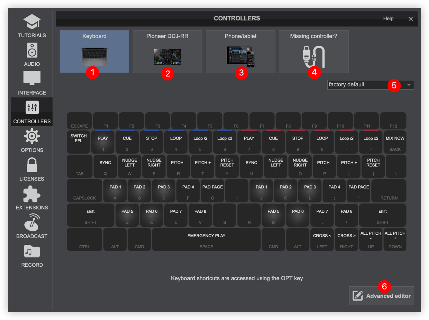 - KEYBOARD MAPPER OPTIONS - The dropdown menu provides the ability to change the keyboard mapper. There are 4 included mappers to chose from: Default, Default (Legacy), Default (Rekordbox compatible), and Default (Serato compatible). An Ignore option is also provided in order to disable the keyboard from using shortcuts if desired.