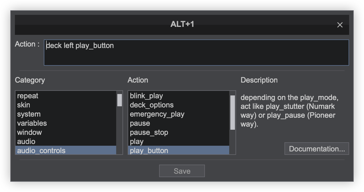 The Editor displays the Key combination at the top, current mapping (Action), as well as displays a list of categories and actions that can be clicked on for quick mapping. Clicking on the Save button will save any changes to the mapping. A Documentation Button is also included to learn more about script actions.