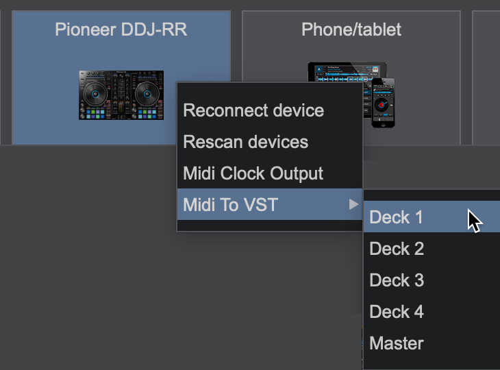 The connection icon provides the status of the device. When the controller is fully connected the icon will display in green. Clicking on the icon will provide options to reconnect devices, rescan for devices, and offer the ability for Midi Clock Output and/or Midi to VST. - PHONE/TABLET - Used to connect the VirtualDJ Remote Application to the software.