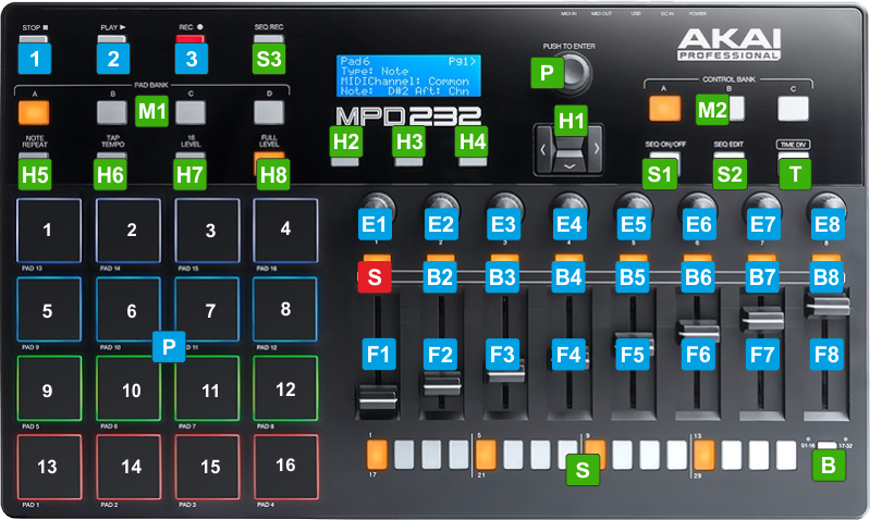 Select one of the 3 available modes for the 8 CTRL knobs, the 8 Faders and the 8 buttons.