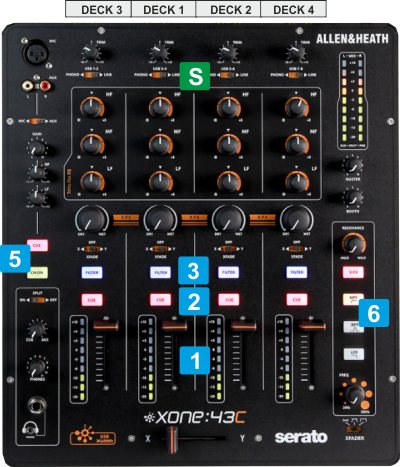 The Allen & Heath Xone 43C is a hardware, stand-alone mixer applying its own audio mixing, Equalizer and FXs with a very limited MIDI functionality. Only the numbered keys as shown in the image below are sending MIDI, and those are either unassigned or assigned in fake mode.