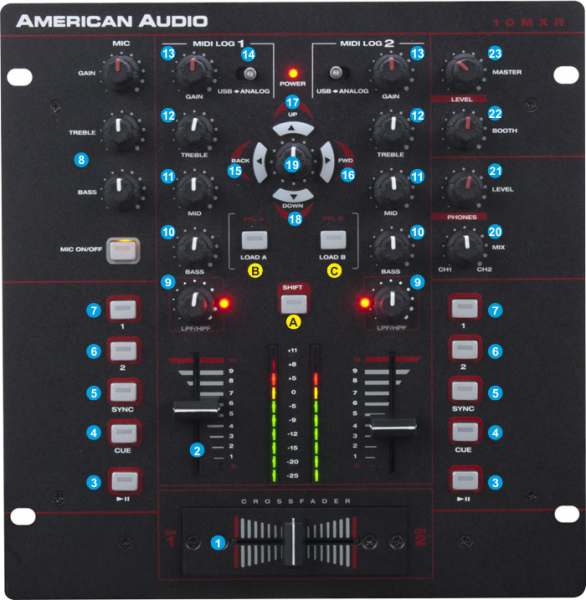 - CROSSFADER. Blends audio between the channels assigned to the left and right side of the crossfader.