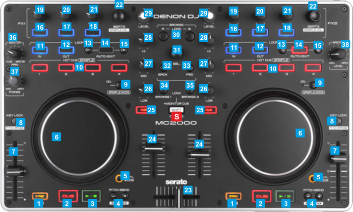 Touch-sensitive platter (jogwheel) for scratching or bending depending on the Vinyl mode