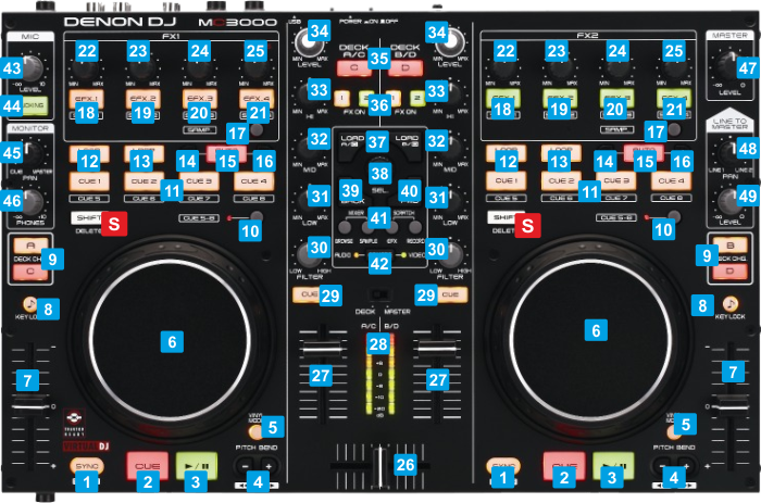 S SHIFTPress this button down to access secondary actions as described in the SHIFT ACTION column1 SYNCMatch deck's tempo (BPM) and Beat-grid phase with the ones from the Master DeckManually select a deck as Master Deck2 CUEWhen track is paused, sets a temporary Cue point and previews track while pressed if the Cue is set. Jump and stop to the Cue point when track is playing3 PLAYPlay/pause deck4 PITCH BENDTemporary slow-down/speed-up deck's tempo. Tempo will resume to the value designated by the Pitch fader when the buttons are released.Search through track's time by 4 beats backwards/forward while buttons are pressed. 5 VINYLSet Jogwheel to Scratch (Vinyl) mode when enabled or to Bend (CD) mode when disabled6 JOGTouch-sensitive platter (jogwheel) for scratching or bending depending on the Vinyl mode