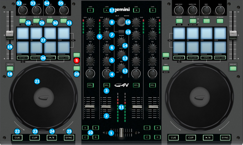 S SHIFTHold this button down to access secondary actions as described in the SHIFT ACTION column.1 CROSSFADERBlends audio between the channels assigned to the left and right side of the crossfader2 VOLUMEAdjust the Volume of each channel.3 CUE (PFL)Send each channel to the Headphones Output channel4 FILTERApply a lowpass to highpass resonance filter effect on each channel's sound. Middle position (12 o clock) deactivates the filter effect5 EQ LOWAdjust the low frequencies for each mixer channel6 EQ MIDAdjust the mid frequencies for each mixer channel7 EQ HIAdjust the high frequencies for each mixer channel8 GAINAdjust the Gain of each mixer channel. Note that the "zero gain / park" position is 12 o clock.9 CH INPUT VUMETERShows each channels input (pre fader) volume10 CROSSFADER CH ASSIGNDefine if a mixer channel will be output regardless of the position of the crossfader (All buttons OFF) or it's Left/Right side (Buttons ON)11 MASTER OUTPUT VUMETERShows the master output volume of the unit12 HEADPHONES MIXINGAdjust how the Channels and the Master Output blend at the Headphones Channel13 BOOTH MONITORAdjust the level of the Booth Output14 MASTER VOLUMEAdjust the level of the Master Output15 BACKCycles focus between Folders, Songs and the SideviewCycles through the available views of Sideview (Automix, Sidelist, Sampler, Karaoke and Clone views)16 BROWSEScrolls through files or folders17 LOADLoad the selected track on the corresponding deckUnload the deck18 DECK SELECTSwitch Left decks (1 and 3) and Right Decks (2 and 4)19 PITCHControls the track's playback tempo20 VINYL MODEToggle the JOGWHEEL between Scratch and Pitch Bend modesToggle the JOGWHEEL between "Search" mode (to seek position inside the track) and normal operation.21 JOGWHEELTouch sensitive platter for scratching (vinyl mode), bending (CD Mode) or Seeking22 CUEWhen the Deck is paused, you can set a temporary Cue Point by moving the Platter to place the Audio Pointer at the desired location and then pressing the Cue Button. During playback, you can press the Cue Button to return the track to this Cue Point. (If you did not set a Cue Point, then it will return to the beginning of the track.). If the Deck is paused, you can press and hold the Cue Button to play the track from the Temporary Cue Point. Releasing the Cue Button will return the track to the temporary Cue Point and pause it. To continue playback without returning to the Temporary Cue Point, press and hold the Cue Button, then press and hold the Play Button, and then release both buttons23 CUPStops the deck while held down, and starts the playback once released24 PLAY/PAUSEPlays / Pauses the track25 SYNCAutomatically match the corresponding Deck's tempo with the opposite Deck's26 PAD MODES Selects a Pad Page (Hotcues, Loop, Sampler, Loop Roll and Manual Loop) For further details see Pads section of VirtualDJ 8 Manual27 PADS Offer different functionality depending on the selected Pad Page for the Left and/or Right Deck For further details see Pads section of VirtualDJ 8 ManualOffer different functionality depending on the selected Pad Page for the Left and/or Right Deck For further details see Pads section of VirtualDJ 8 Manual28 KEYLOCKLocks the track's pitch to the current keyCycle through the available pitch range values29 SAMPLER BANK SELECTSelect the next Sampler BankSelect the previous Sampler Bank30 FX SELECTSelect the next available effect31 FX ONSelect the next available effect32 LOOP MOVEMoves the loop33 SAMPLER VOLUMEAdjusts the volume of the sampler34 FX PARAMETER 1Controls the 1st parameter of the selected effect35 FX PARAMETER 2Controls the 2nd parameter of the selected effect
