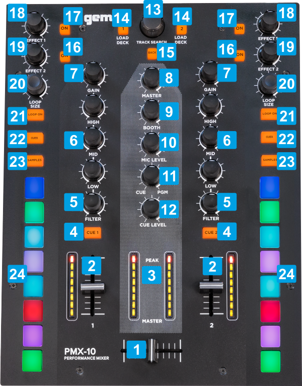 Hold this button for more than 2 seconds, to switch the input of the Left/Right mixer channel to the analogue source (connections at the rear panel) or back to MIDI (for VirtualDJ Deck control)