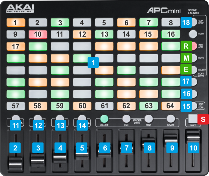 The LED of a Pad will be green when a Sample is playing, yellow if the slot is loaded but the sample is not playing and off when slot is not loadedStop Sample 1 to 64R + 1 REC + PAD 1-64In Record mode : Start/stop recording active deck to Sample 1 to 64 of the Recordings Bank of Sampler. LED of the Pad will fast blink red while recordingM + 1 MUTE + PAD 1-64In Mute mode : Mute/unmute Sample 1 to 64. LED of the Pad will be red while mutedE + 1 SELECT + PAD 1-64In Edit mode : Open Sample 1 to 64 in the Sampler Editor2 - 9 GROUP VOLUME 2-9Adjust the Volume of the Sample Group 1 to 810 MASTER VOLUMEAdjust the Master Volume of the Sampler Output11 UPSelect the previous available Sampler BankOpens the Recording Bank of Sampler 12 DOWNSelect the next available Sampler BankOpens the Recording Bank of Sampler 13 LEFTSelect the previous available Sampler Trigger mode14 RIGHTSelect the next available Sampler Trigger mode15 STOP ALL CLIPSStops all playing Samples16 BUT1Open/Close Sideview panel of BrowserCycles through the available Sideview windows (Automix, Sidelist, Sampler, Karaoke & Clone) 17 BUT2Selects the Sampler view in the SideviewToggles between the Trigger Pad and List view of the Sampler window of the sideview 18 STOP CLIPStops the currently selected/playing Sample