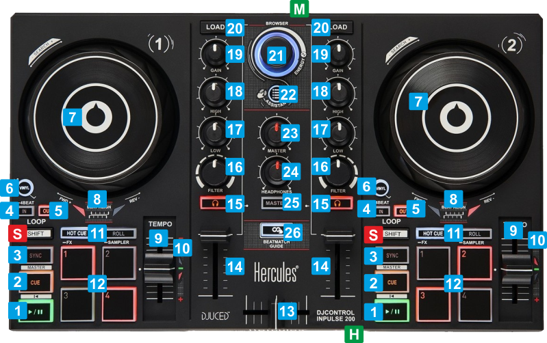 1 PLAYPlay/Pause the track loaded to left/right deckPlay-stutter track. When pressed, track will resume playing from the previously stopped position2 CUESets current position as Temporary Cue point. Preview track when paused while button is pressed Jumps and stops to the Cue point when playing[Returns to the beginning of the track3 SYNCMatch BPM and Beat Phase with the opposite deckSmooth pitch reset. When pressed track will gradually get its original tempo4 LOOP INWhen not in loop, press to set current position as the beginning of a manual loop. Press and hold this button for more than 1 second to turn a 4 beats auto-loop on/offHalf the size of the loop5 LOOP OUTWhen not in loop, press to set current position as the end of a manual loop. When in loop, press to exit the loopDouble the size of the loop6 VINYLEnable/disable Vinyl mode. When enabled, use the upper/top surface of the jogwheel to scratch and the outer to bend. When disabled, the entire surface (upper and outer) of the jogwheel will be used for bending.7 JOGWHEELTouch-sensitive jogwheel for scratching or bending (temporary speed up/down tempo) the track, depending on the Vinyl mode.Fast seek (search) track forward/backwards8 BEAT ALIGNThese leds indicate the direction the jogwheel needs to be moved to, in order its beat-grid to match with the opposite deck. Leds will operate if: - the BeatMatch Guide button [26] is turned on - the Deck is not the Master-Deck (deck that is playing out live - on air) - the deck is not playing9 TEMPOAdjust the tempo of the loaded track When in middle position (green led is turned on), the track plays at its original speed..10 TEMPO ASSISTANT LEDsWhen turned on, the LED will indicate the direction the Tempo fader needs to be moved in order the track to get the same BPM as the opposite one. When a LED flashes, indicates the direction the Tempo fader needs to be moved in order the actual/hardware fader to catch the software tempo value and re-gain tempo control from the Inpulse. This can happen if the SYNC button is pressed and the track gets a tempo value different than the one the hardware fader designates. Both LEDs will operate only when the BeatMatch Guide button [26] is enabled. .11 PAD MODESSet the 4 Pads to Hotcue, Roll, FX (long press of Hotcue button) or Sampler (long press of Roll button) mode. See Pads page for further details.12 PADSThese buttons offer different functionality depending on the selected Pads mode See Pads page for further details.These buttons offer different functionality depending on the selected Pads mode See Pads page for further details13 CROSSFADERWhen on far left position, only sound from the left deck will be heard from the Master Output. When at far right position, only the sound of the right deck will be heard from the Master Output. In all other positions, the audio signals from left/right decks will be blend. 14 VOLUMEAdjust the Volume of the Left/Right deck15 PFLUse these buttons to send the pre-fader audio signal of the Left/Right deck to the Headphones channel for pre-listening (connection at the front side).16 FILTERUse these knobs to apply a High/Low Pass Filter to the Left/Right deck. No Filter is applied (off) when the knob is at the center/middle position17 LOWUse these knobs to cut/boost the frequencies of the Low/Bass Equalizer Band No adjustment is made when the knob is at the middle/center position18 HIGHUse these knobs to cut/boost the frequencies of the High/Treble Equalizer Band No adjustment is made when the knob is at the middle/center position19 GAINUse these knobs to adjust the pre-fader output level of the Left/Right deck When the knob is at the middle/center position, the track will be at zero dB level (or any other value set in VirtualDJ Options)20 LOADUse these buttons to load the selected track from the Browser to the Left/Right deck. Double/fast-press these buttons to clone the track from the opposite deck to the Left/Right deck.Unload the deck 21 BROWSERUse this dial to scroll through the folders or tracks, depending on the focused Browser List. Push the dial, to toggle focus between the Folders and Songs Lists. When focus is on the Folders List, push and hold dial down (for about 1 second) to open/close sub-folders. The RGB led of this dial indicates the currently playing out deck (on air), blue for Left deck and red for Right deck Push to toggle between Normal and Zoom Browser view (applies to default VirtualDJ GUIs and other custom ones that support Browser zoom 22 ASSISTANTUse this button to select the Recommendations folder and get online suggestions based on the currently playing track. Press again to select the previously working folder.23 MASTER VOLUse this knob to adjust the level of the Master Output (connection at the rear panel).24 HEADPHONES VOLUse this knob to adjust the level of the Headphones Output (connection at the front panel).25 MASTER PFLUse this button to send the audio signal from the Master Output to the Headphones channel. Hardware operation, not visible in GUI or controlled from VirtualDJ26 BEATMATCH GUIDEUse this button to enable/disable Beat-Match Guide. When enabled, the Beat-Align [8] and Tempo assistant [10] leds will offer their described functionality Pads