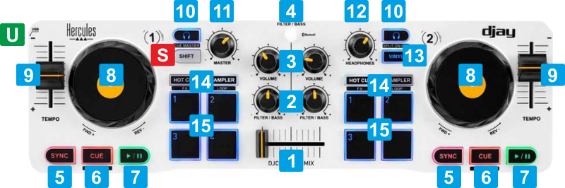 S SHIFTPress this button down to access secondary actions as described in the SHIFT ACTION column1 CROSSFADERBlends audio between the Left and Right decks2 FILTER/BASSWhen Filter mode is enabled : Apply the selected Color FX (by default a High/Low Pass Filter) to the Left/Right deck. When in middle position, no Color FX is applied. When Bass mode is enabled : Adjust the low/bass equalizer frequencies of Left/Right Deck .3 VOLUMEAdjust the Output volume of the Left/Right Deck.4 FILTER/BASS MODEToggle between Filter and Bass modes.5 SYNCSyncs deck with the opposite one (matches BPM and phase).Smoothly reset Pitch to zero value6 CUESet a temporary Cue point at current position when track is paused or preview while pressed if Cue point is assigned. Return to this Cue point when track is playingJump to the beginning of the track7 PLAYPlay-pause loaded trackPlay-stutter loaded track8 JOGTouch-sensitive jogwheel for scratching (when Vinyl mode is enabled) or pitch-bending (when Vinyl mode is disabled). Fast-searching through loaded track9 PITCHAdjust the tempo/pitch of the Left/Right Deckdeck..10 PFL Sends left/right deck's audio (pre-fader) signal to the Headphones channel as defined in Audio setup, for pre-listening Left PFL : Sends Master output /Mix to Headphones. Right PFL : Splits Left/Right Headphones channels for Master & Decks11 MASTERAdjust the Master Output Volume.12 HEADPHONESAdjust the Headphones Output Volume.13 VINYLToggle Vinyl (Scratch) and CD (Bend) modes for both Left/Right Decks.14 PAD MODESHOTCUE : Sets Pads to Hotcues page SAMPLER : Sets Pads to Sampler pageHOTCUE : Sets Pads to FX page (led blinks). A special Pads page, available only when DJControl Mix is connected SAMPLER : Sets Pads to Loop page (led will blink)15 PADSOperation depends on selected Pads mode. See Pads in VirtualDJ manualOperation depends on selected Pads mode See Pads in VirtualDJ manual
